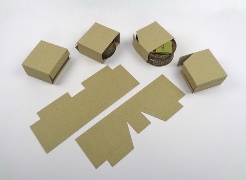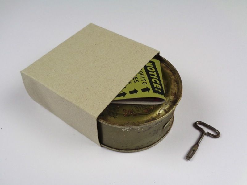 The key for opening the can is shown on the sleeve for visibility but should be placed inside the sleeve on top of the can. The matchbook is placed inside the sleeve on the other side of the can.