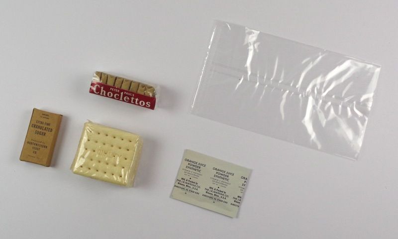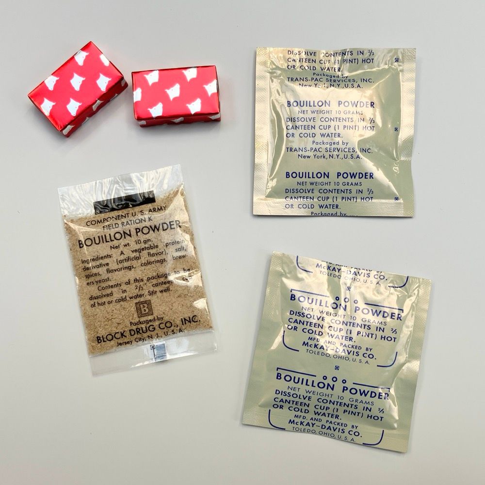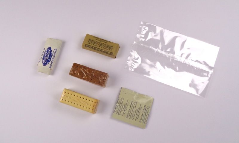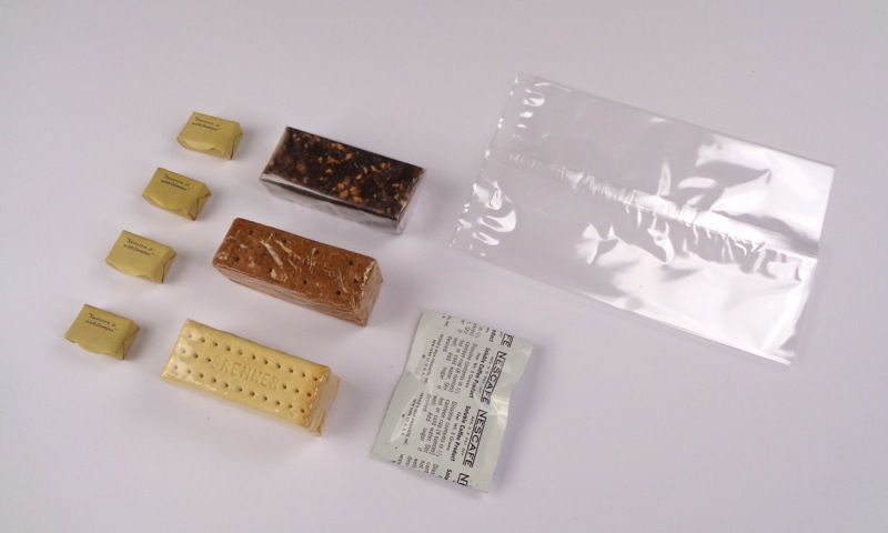 Supper: Chocolate bar, envelope of Bouillon powder and 2 packages of Biscuits or one package of square Biscuits. The toilet paper is not sealed in the cellophane bag with the food components (although this was done sometimes).