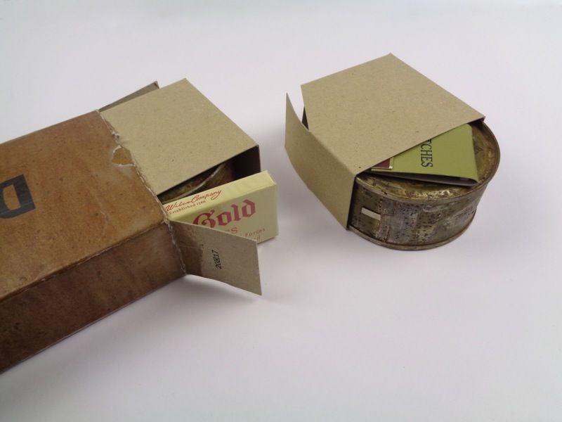 Included in the ration kits are matchbook covers. To make a complete matchbook you need to get a modern matchbook (preferably with cardboard matches) from which you remove the matches by pulling out the staple.