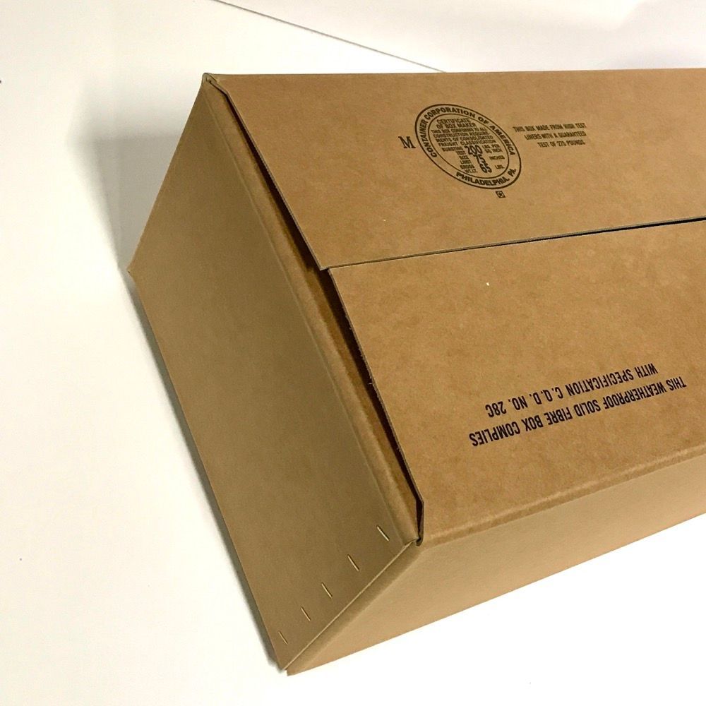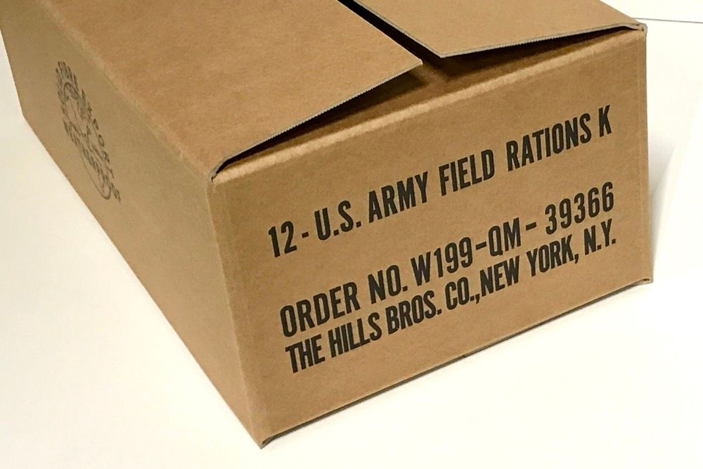This Solid fiberboard box is perfect for packing twelve Hills Bros. K ration kits.